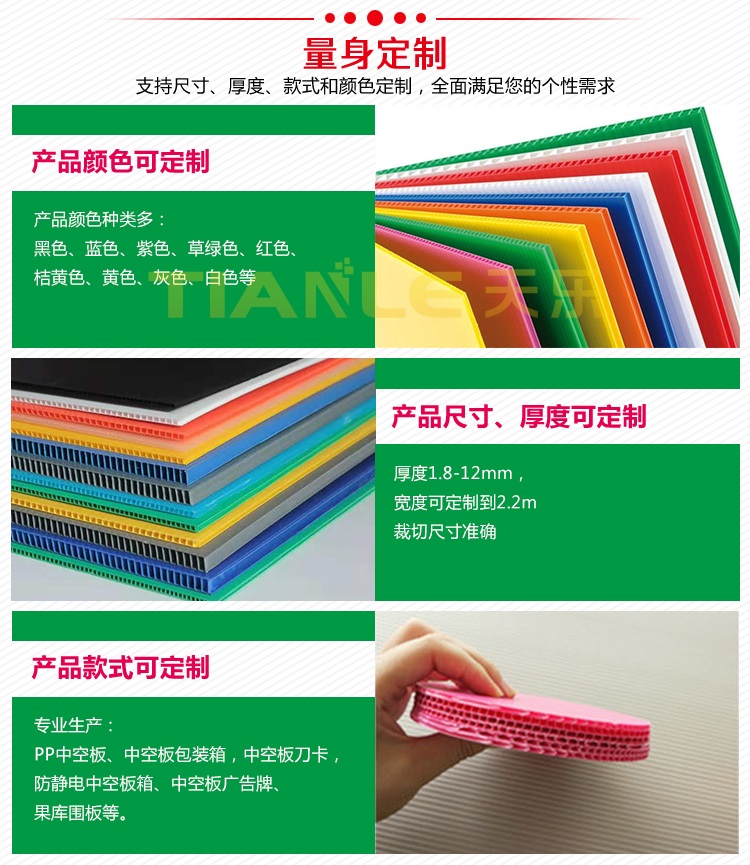 中空板產(chǎn)品年產(chǎn)量4000余噸,寬幅可以做到2300mm,厚度1.5-12mm,長度不限。主營生產(chǎn):PP中空板、中空板刀卡、中空板包裝箱、防靜電中空板箱、中空板廣告牌、果庫圍板、墊板隔板等。公司擁有PP中空板自動生產(chǎn)設(shè)備、自動模切機十余臺,擁有經(jīng)驗豐富的設(shè)計研發(fā)團隊,支持產(chǎn)品量身定制服務(wù),截止目前已服務(wù)2000多家不同行業(yè)客戶。